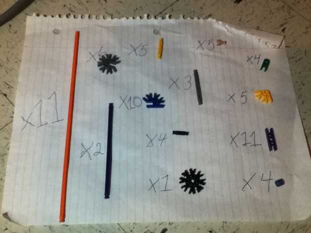 El conteo de las piezas que he usado (me olvidé de mostrar una pieza piezas de forma i también utiliza dos 5 (mina son rojo) y usé una barra roja (ver referencia paso))