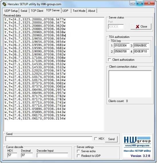 Por el lado de recepción de los datos tenemos el software Hercules. Se TCP servidor ingresa el puerto en la del pestaña de comienzo de y comunicación una escuchar. Se debe tener una IP y el puerto habilitado en el router. En la siguiente imagen se aprecia la recepción de los datos desde el sistema.