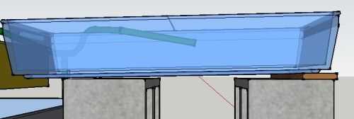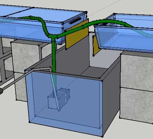 Si nos fijamos en la primera foto, verás una bomba en la parte inferior del envase grande que almacena el agua entre el relleno y el drenaje (AKA "el depósito"). Una manguera se conecta a esta bomba y fracturas apagado en los dos contenedores que sostienen la grava y las plantas.