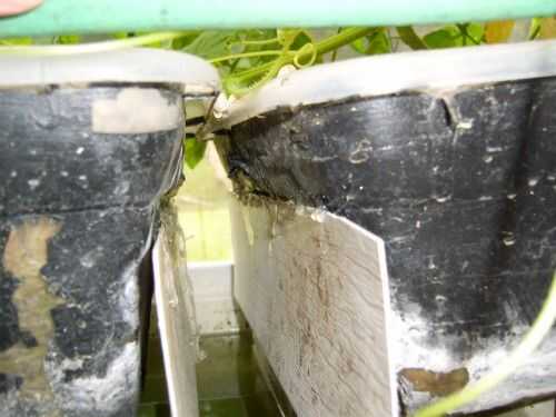 El plástico es celebrado con pegamento caliente. Usted puede ver en la foto que he hecho un lío de él. No pienso hacerlo hasta después de que puse en la grava del guisante, y era difícil conseguir suficientemente lejos aparte para la pistola de pegamento caliente caber entre los contenedores.
