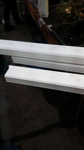 Dependiendo de sus plantas, el espaciamiento de los agujeros será diferente. Quería 3 pulgadas entre cada planta, así que mide 3 pulgadas desde el extremo del canal y orificio de cada 6 pulgadas utilizando el orificio. Esto me deja con una diferencia de 3 pulgadas entre cada taza neta que es lo que quiero! Corté todo hasta el final pero con 6 pulgadas desde el extremo del canal. Cortar 4 canales de 10 pies con estas medidas para encajar en el invernadero.