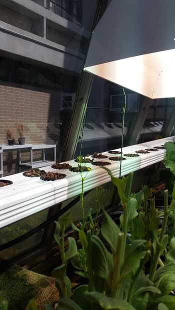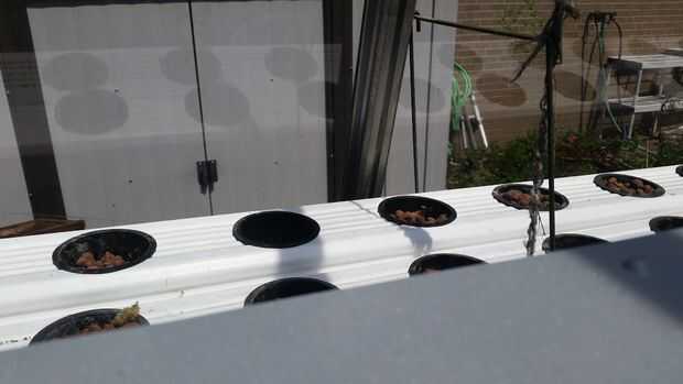 Para colgar los canales, colgado con soportes de estante de alambre que fueron en mi invernadero, pero también se pueden utilizar abrazaderas de plástico grande. En orden a la deuda por lo tanto, conecta dos abrazaderas de plástico para hacerlos más largos y ponerlos bajo la cuneta y zip todo para su stand o en mi caso hasta el techo. Pero una cosa muy importante es asegurarse de que el montaje de canalón es unas pocas pulgadas más alto que el depósito de agua.