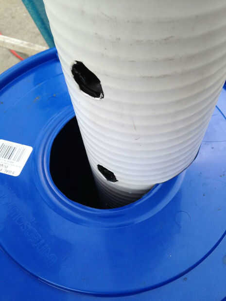 Ahora marque el lugar donde vas a colocar el tubo de PVC a través de. Antes de hacer que tu bomba de agua de fuente encaja perfectamente entre el tubo y cubo de la pared. de lo contrario se inclina el tubo. Tuve que cortar un poco más compensado debido a mi tamaño de bomba. Una vez tienes la ubicación de cortar el agujero con y cuchillo o exacto.