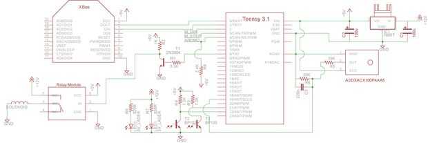 El solenoide es una válvula eléctrica simple que se abre al aplicar energía. Para abrirlo lo conectó para transmitir directamente a la batería. El relé conectado a la placa Teensy a través del transistor para evitar sobrecargar el Teensy pin (que no capaz de proporcionar muchos amperios). El relé conectado al pin 8.