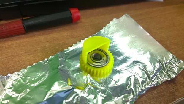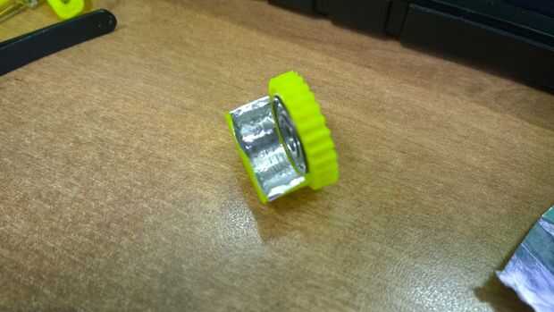 A continuación necesitamos hacer un reflector para reflejar parte de la luz. Corte un pedazo pequeño de papel de aluminio para que coincida con la sección interior del gear.stl de bering. Aplique pegamento en el engranaje y empuje suavemente el aluminio en el interior.