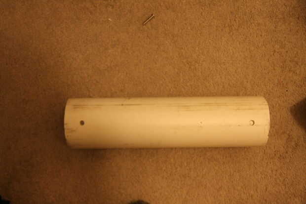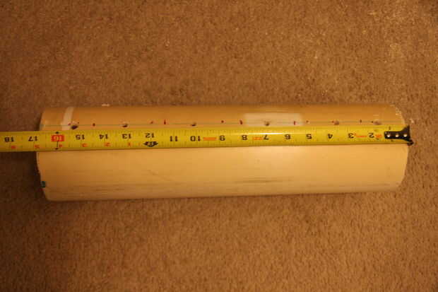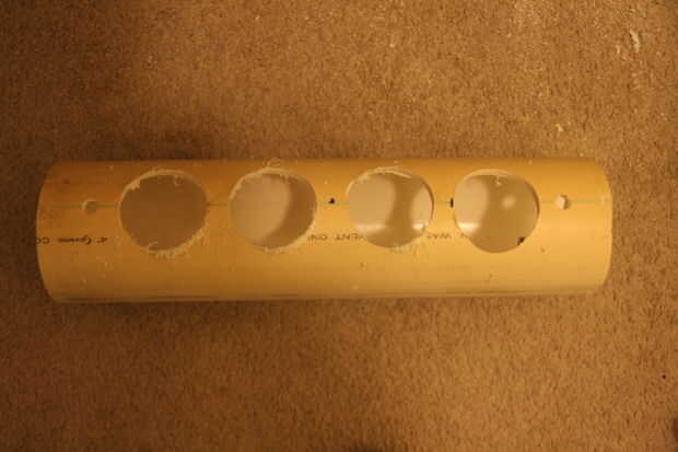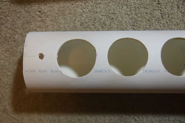 Taladré los 3/4" agujeros para los soportes 1-1/2" desde cada borde. No olvides perforar agujeros adicionales en la parte inferior para el segundo soporte de perno en cada nivel (excepto en el nivel inferior). En este punto usted tiene 13" de izquierda espacio utilizable. En mi caso estoy utilizando 4 2-1/2 agujeros para las plantas. 2-1/2 "x 4 = 10" Esto deja 3" para el espaciado. Puesto que necesitarás 5 espacios, que te deja con 3/5" entre el borde de cada agujero vieron. El tubo es muy robusto con este espacio para mantener cada uno mantenga por lo menos esto lejos aparte, sobre todo si hacen el tuyo más. En este punto usted puede limpiar los bordes con un papel de lija y pintura si lo desea.
