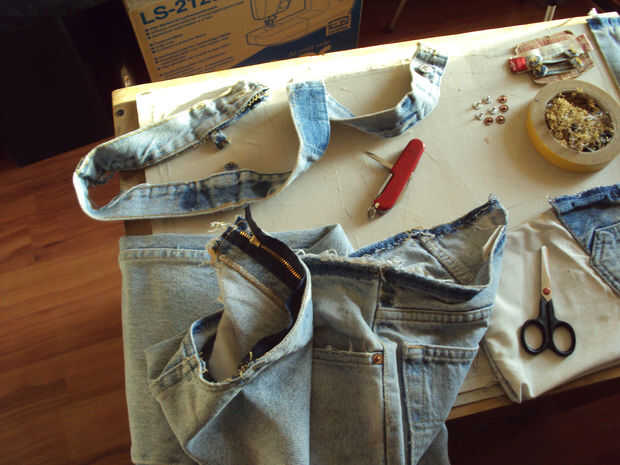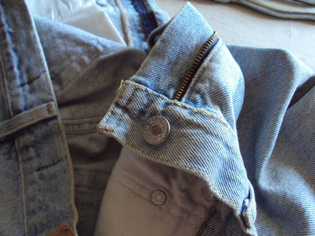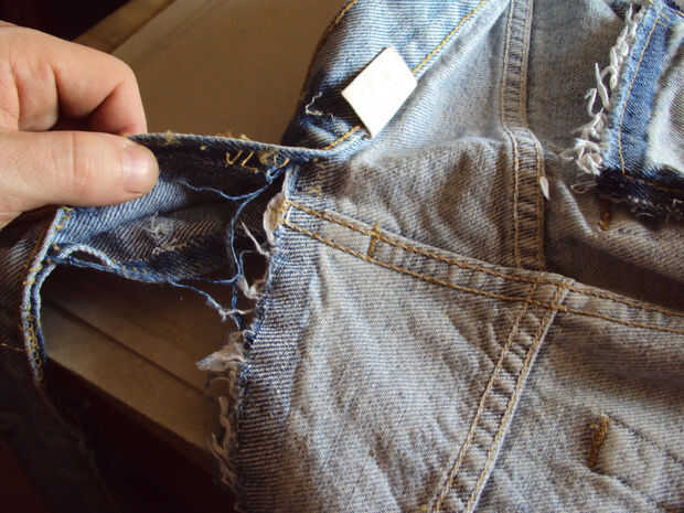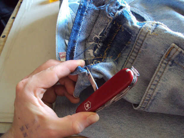 Partiendo por donde esta el botón, rompe los hilos en la parte une la cintura con la pierna del pantalón y continua por todo su largo hasta deshacerla por completo.