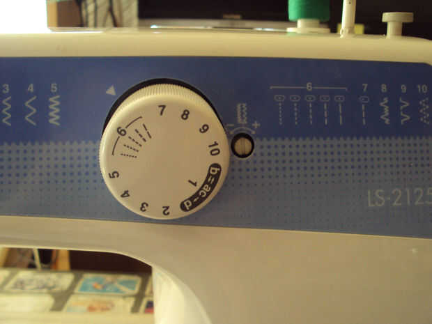 Para terminar los bordes largos de las huinchas, gira el selector de puntadas a la posición de modelo recta con el ancho deseado (#6 en este caso) y dobla el borde del rectángulo de tela en la línea intermitente anteriormente marcada y métela debajo del ojat. Al inicio de la costura recta, ondeada unas 5-10 puntadas para trabar los hilos y continua por todo el largo de la huincha hasta llegar al final del rectángulo. Repite el proceso para generar una segunda costura de puntadas rectas al lado de la primera. De esta manera refuerzas la terminación del borde de la huincha y repite los pasos para el otro borde y en los otros rectángulos de tela.
