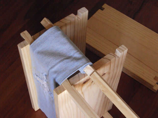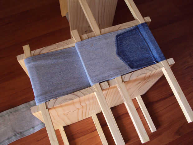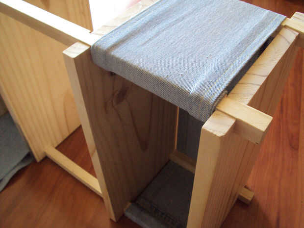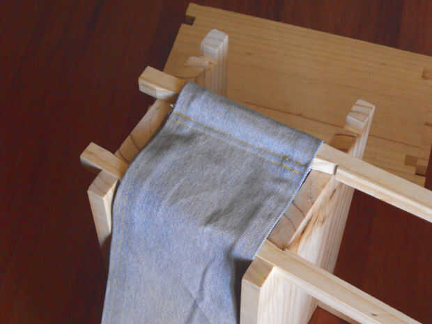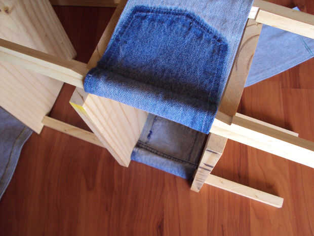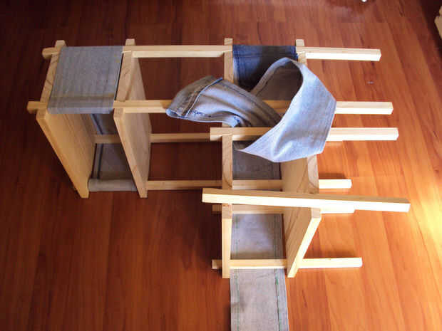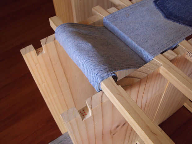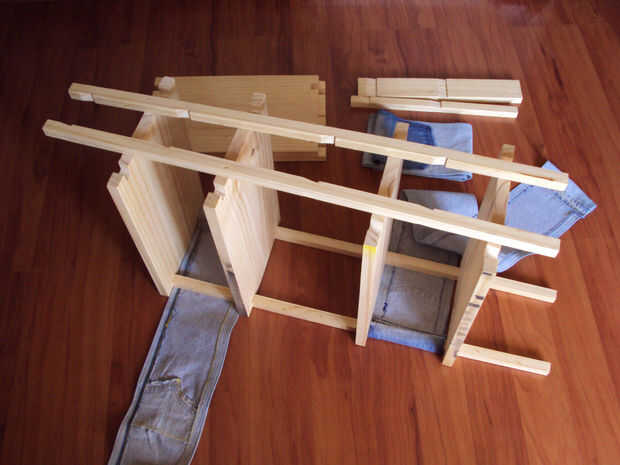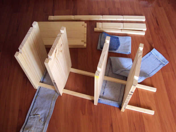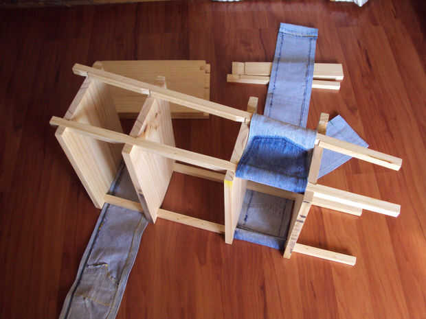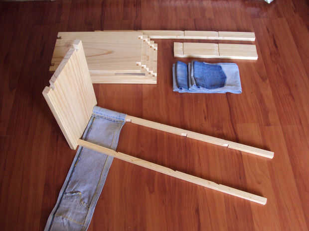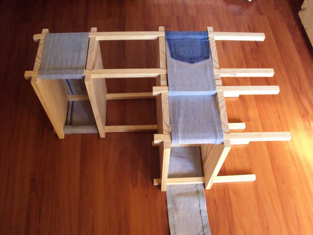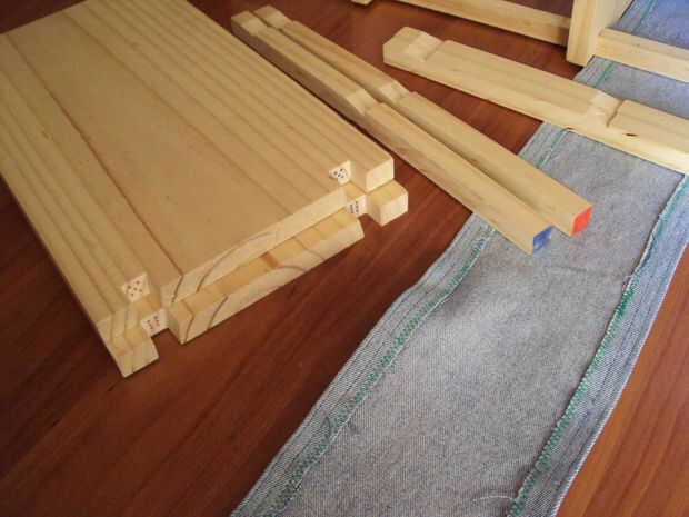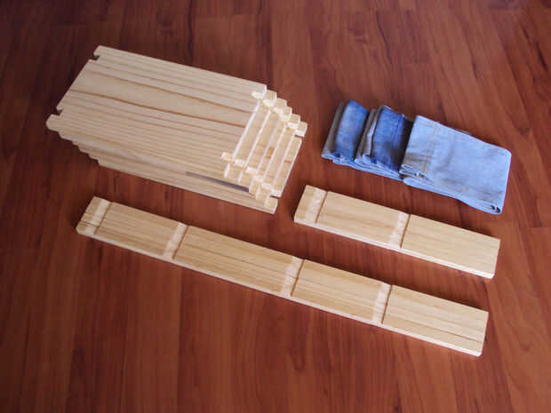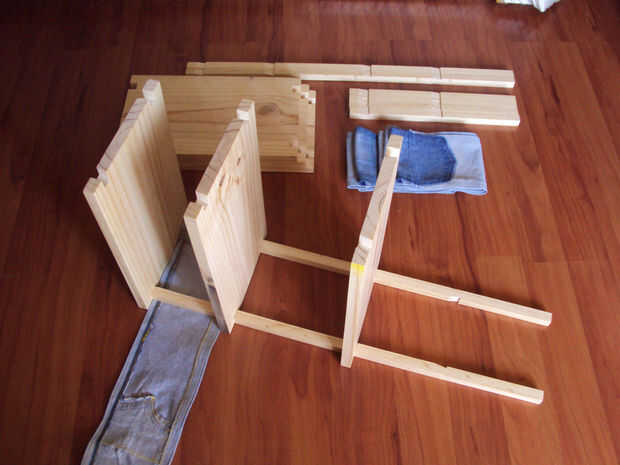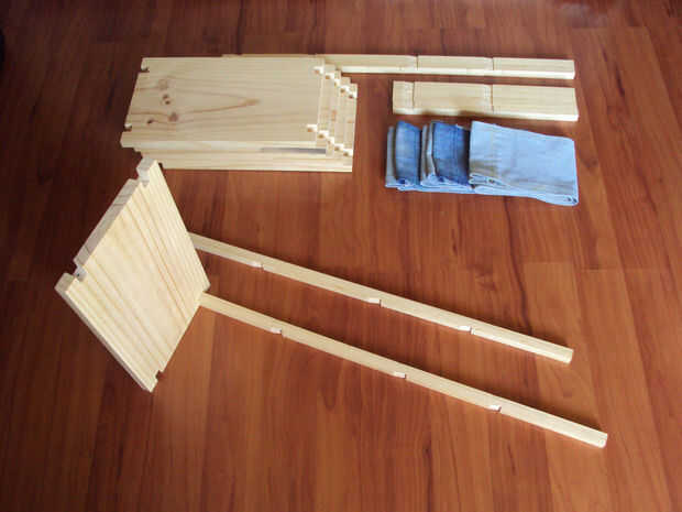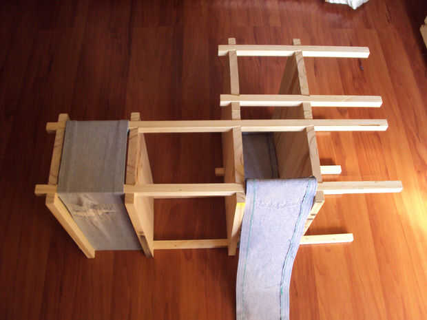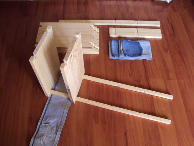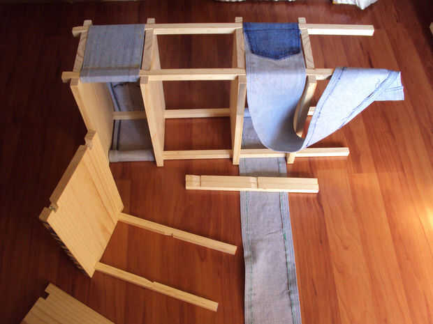 Al tener todas las piezas contó y seleccionando los listones con el color correspondiente a los números en el sacado de la repisa del primera, comienza a encajar las piezas de madera. Antes de encajar la segunda repisa, desliza el bucle de la primera huincha (cualquiera de las tres) hasta tope con la primera repisa. Luego, encaja la segunda y tercera repisa, y desliza la segunda huincha hasta topar con la tercera repisa y encaja la cuarta repisa. Ordena los listones largos restantes según su color y desliza la tercera huincha hasta topar con la tercera repisa y encaja el tercer listón. Pasa el cuarto listón por el bucle en la primera huincha y enrolla el listón unas 2 a 3 vueltas o hasta tensar la huincha y encaja el listón para completar el módulo alto. Con las repisas y listones restantes, comienza a armar el segundo módulo (bajo) entrelazando la tercera huincha entre los listones y pasa el listón frontal del módulo bajo por el bucle en la misma huincha. Enrolla el listón hasta tensar la huincha y encaja el listón en la quinta y sexta repisa, uniendo así ambos módulos y repite los pasos para el otro lado del módulo bajo.