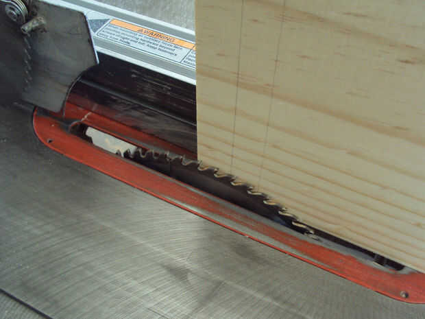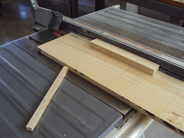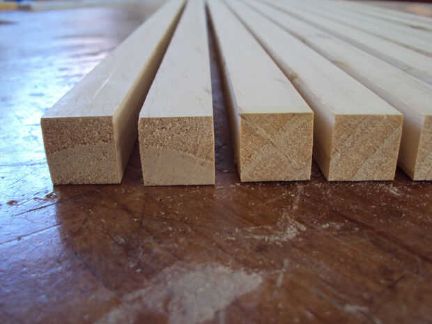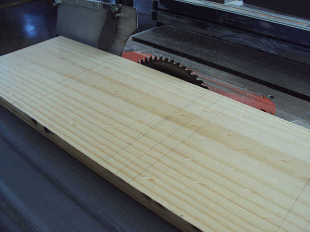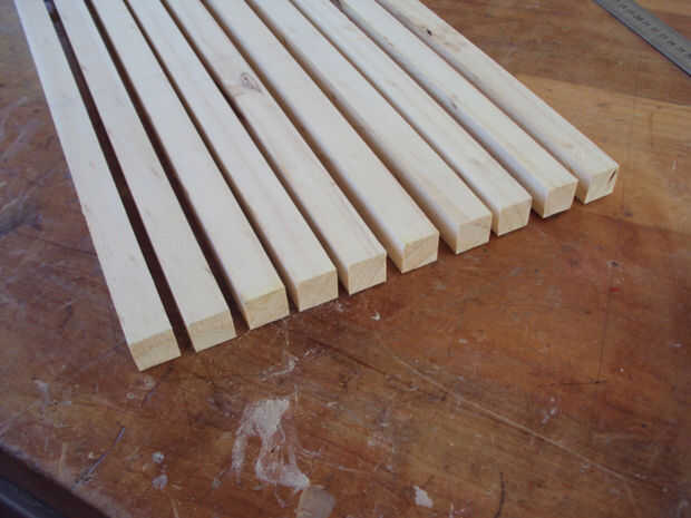 Utiliza una sierre circular de banco para dividir la tabla larga en listones. Para tu seguridad, ajusta la altura de la sierra para los dientes atraviesen la tabla unos 3mm aprox. El grosor de la tabla sirve para fijar la guía de corte en la máquina y comience el corte. Utiliza unos restos de madera para desplazar la tabla, evitando así acercar las manos a la sierra y capitana los listones por atrás. De la tabla larga se consiguen diez listones. Cada listón Yes tener un perfil cuadrado de 1, 8 x 1, 8cm aprox. Para este mueble se utilizan séis listones enteros. Los cuatro quedan se pueden usar para reparaciones futuras u otras configuraciones del mueble.