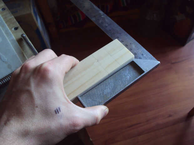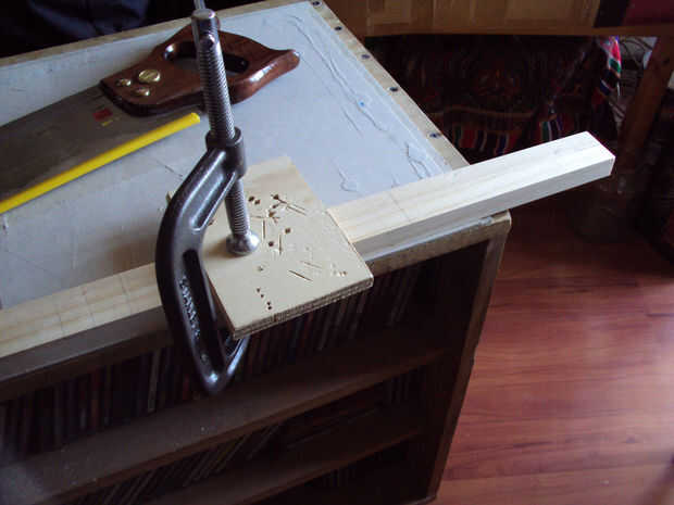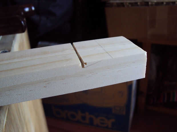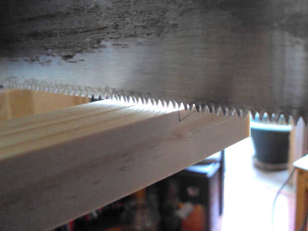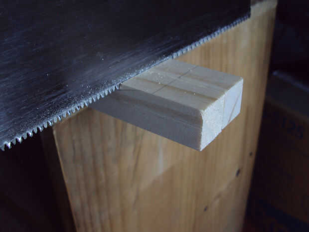 Junta dos de los listones hasta las líneas calcen y fíjalos con una prensa.  Con una sierra de costilla comienza lentamente un corta la guardabarros hasta llegar a una profunidad de 4mm aprox.  Repite en todos los listones superándose anteriormente.