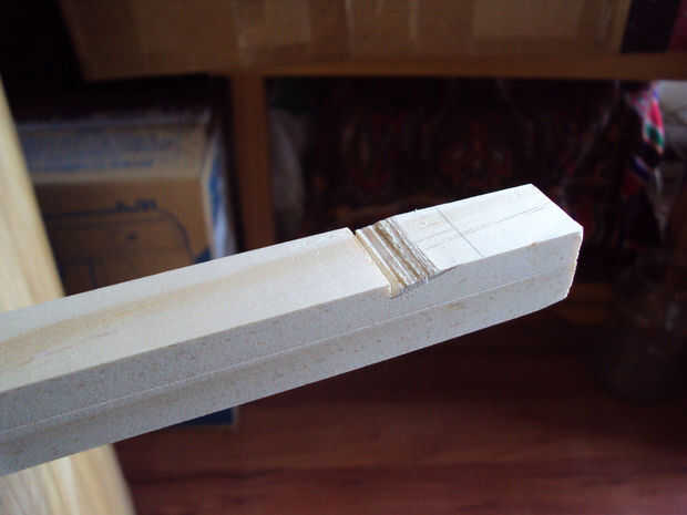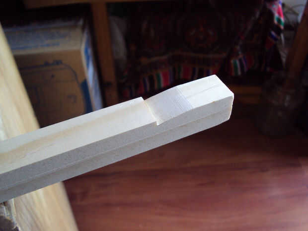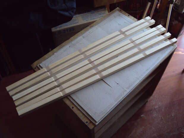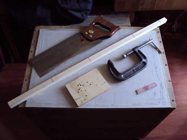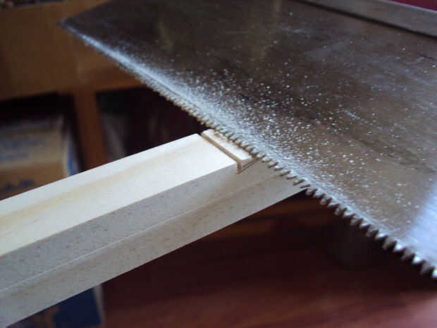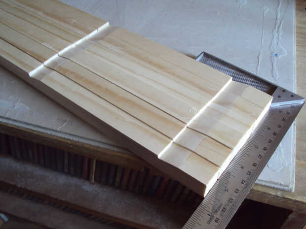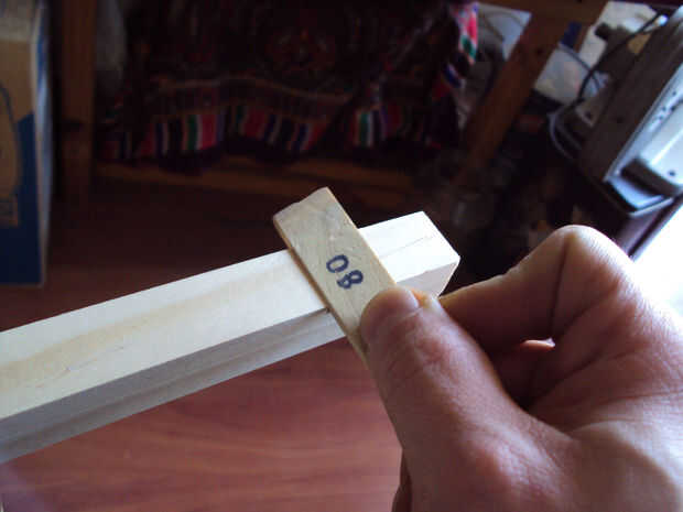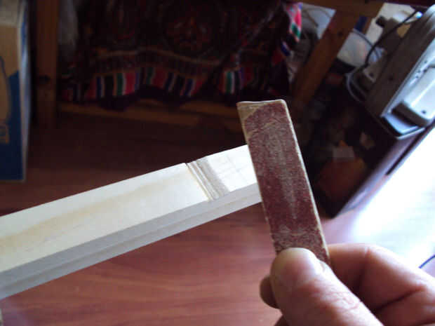 Listón de la cartilla de el de la prensa de la Fija con la e inclinando la sierra, corta en dirección extremo según las marcas generado en PASO 5, reinsertando la mayoría del sacado para así reducir el tiempo de lijado posterior. Pega con cinta doblefaz, un papel de lija de grado 50 un un trozo de la franja de madera restante de PASO 2. Esta herramienta sirve para desbastar lo queda del sacado, teniendo cuidado con el ángulo de lijado, para el sacado quede lo más parejo posible. No lijes demasiado ya más adelante se harán los t.c. finales en los sacados. Repite los pasos para todos los listones. Los sacados deberían quedar parejos en todos los listones.