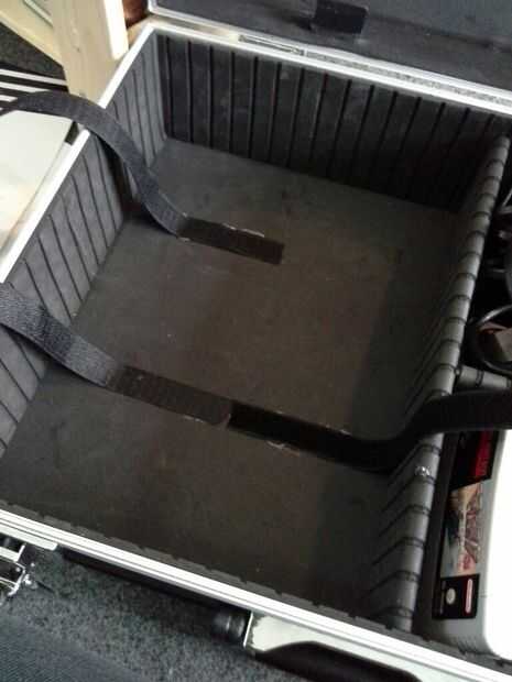 Queremos que la SNES y los juegos para estar seguro en su lugar. Toma tu cinta de gancho-up-lazo y pegamento en el interior de la maleta, como se muestra en las fotos. La cinta debe ser suficientemente largo para apretar la SNES y los juegos de seguros en su lugar. Además tienes que pegar sus separadores de cartón en la maleta para evitar que se mueva.
