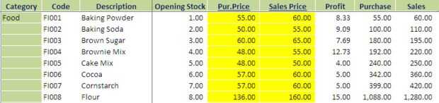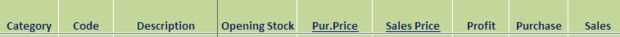 De acuerdo con esto, tomar todos los artículos de inventario y crear un código y actualizar hoja con apertura de stock, pur.price y Seles precio. Usted tiene que dar la correcta compra precio y ventas los precios porque cuando emite una factura, precio elegirá de esta hoja. Balance de apertura será enlace con stock balance.