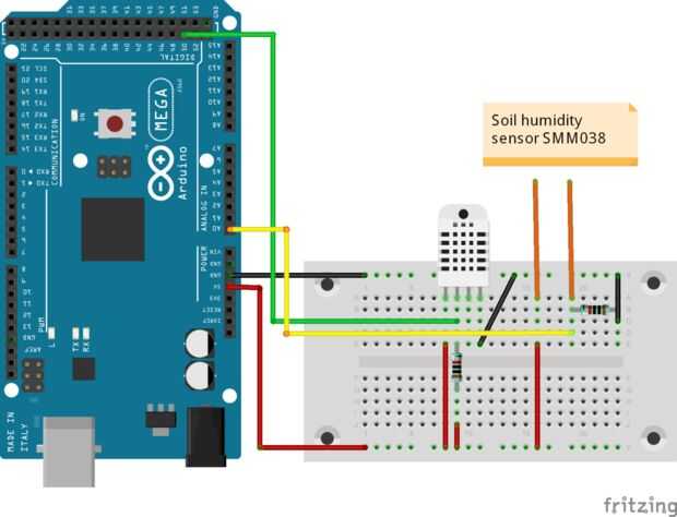 Sensor de humedad de suelo conectada a través de un circuito divisor de tensión con resistencia de 10kOhm como una resistencia permanente. El sensor produce una señal analógica y conectado al pin A0 de la Arduino.