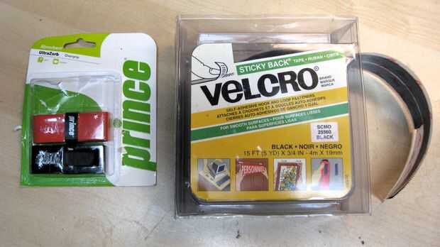 1. envoltura de empuñaduras de raqueta de tenis. -Éste pasa a ser príncipe, pero funciona cualquier overgrip fino barato.