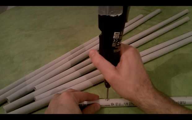 Luego he corté 8 tubos de PVC del mismo tamaño (algo así como 80 cm de largo) y pequeños orificios para los cables conectados a los planetas (algo así como taladros Ø 2mm) a distintas distancias según los planetas que están conectados a.