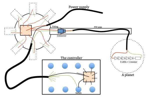 Como quería algo que fuera fácil de llevar, he añadido los conectores en el extremo de cada cable. Y en la araña de plástico, he hecho lo que yo llamo una "araña eléctrica", con los conectores (8 de los planetas) y 2 para el sol. -De cada conector está conectado a la - de la potencia de la fuente cable que viene de la araña de plástico, y el + de los conectores están conectados al + de la energía de la fuente.