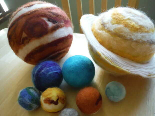 Pero sí sé cómo húmedo fieltro y fieltro de la aguja. Así que aquí está mi interpretación de Sistema Solar móvil de yosyam, hechos con lana de mecha y de fieltro.