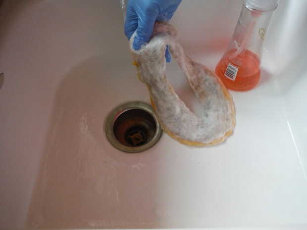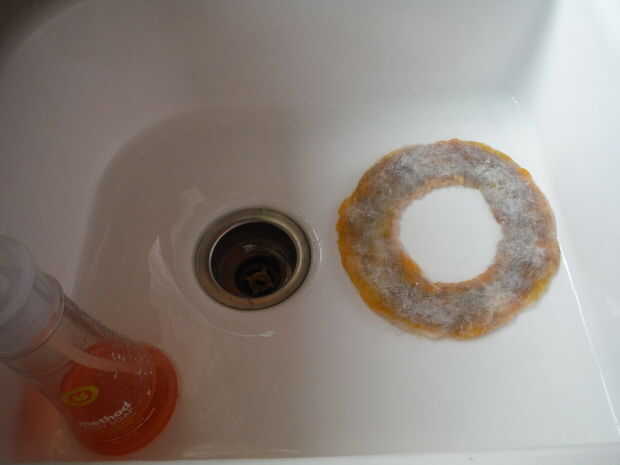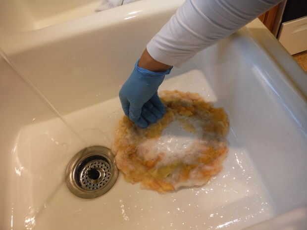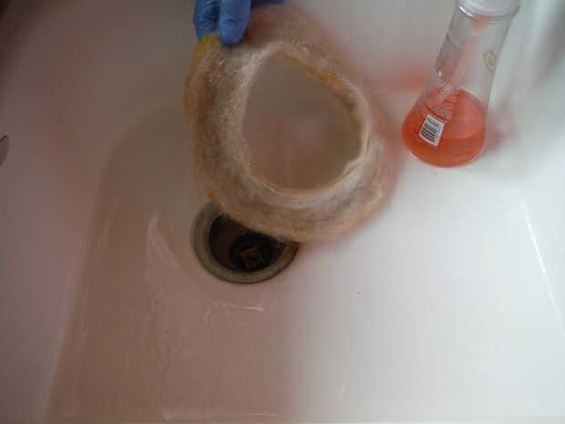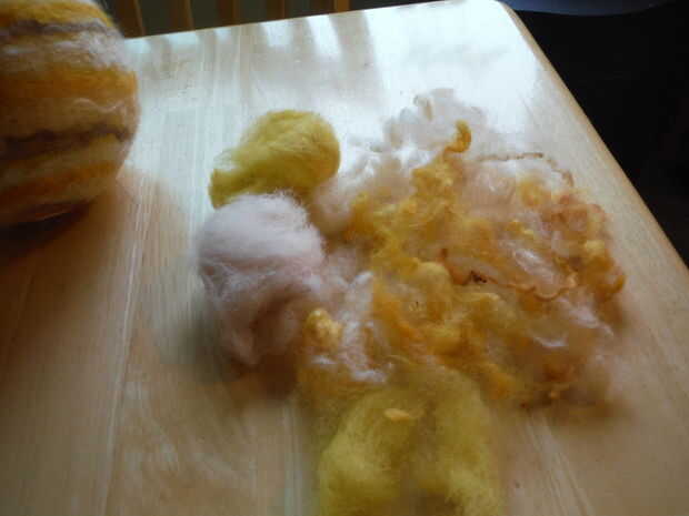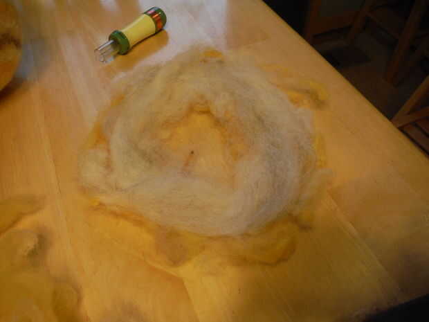 Fieltro anillos de Saturno es un proceso de mojado fieltrar múltiples, sólo porque quería usar algunos desechos rizados de la lana de amarillo. Primero puse una base de fieltro en un círculo y rasgados aguja de fieltro de lana amarillo en el anillo a virar en su lugar (uso un pedazo de espuma gruesa debajo de su lana para que no la aguja sintió en la mesa y romper las agujas de púas) en lana gris/blanco pálido. Luego felted el anillo, usando el mismo proceso los planetas como mojado fieltrar: agua caliente, jabón, agitación y por último, enjuague con agua fría; mantener el anillo en la parte inferior del fregadero y frotar la superficie del anillo con pequeños movimientos circulares con mis dedos para tejer las fibras juntas. Volcó el anillo del fieltro y me frotó el otro lado antes de enjuagar en agua fría para contraer las fibras.