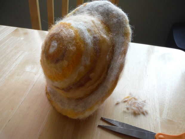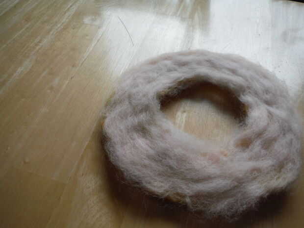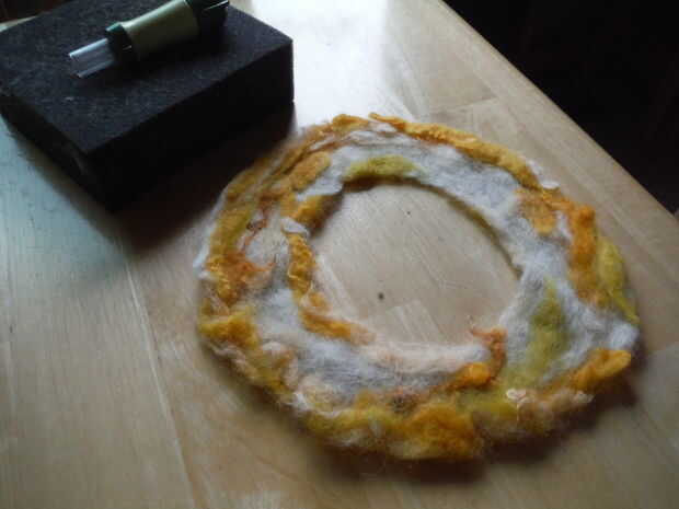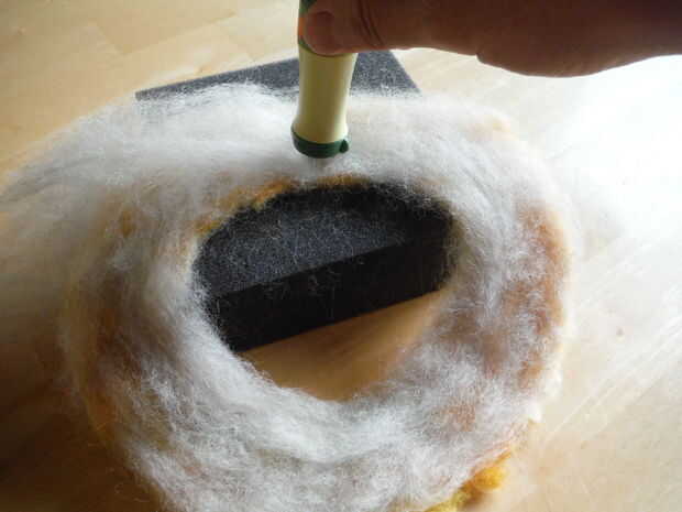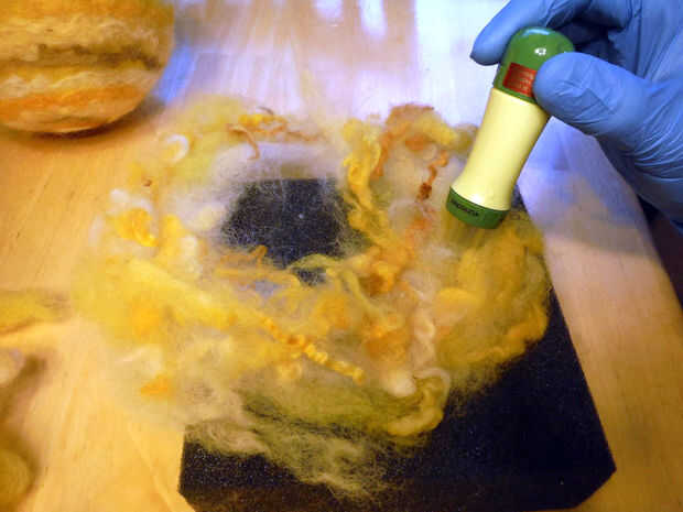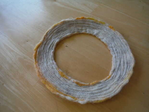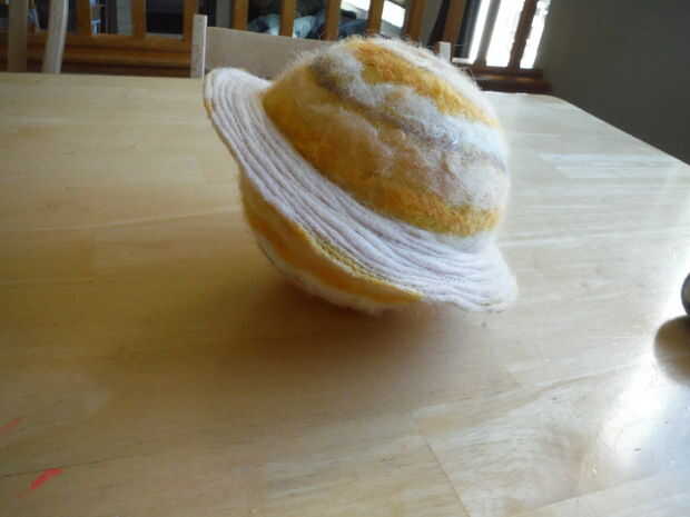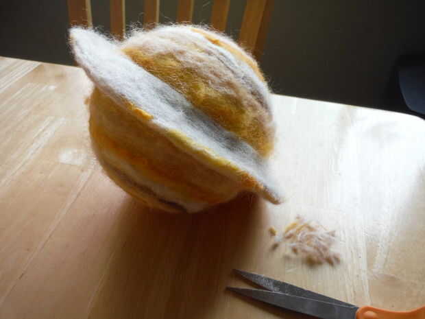 Después de secar el anillo de fieltro, no era lo suficientemente espesa para mi gusto, así que needled fieltro lana más claro en ambos lados del anillo de lana afieltrada y húmedo fieltro el fieltro nuevo al ring. Después de la segunda batanado de mojado, el anillo era suficientemente lo suficientemente grueso como para aguantar su propio alrededor de Saturno sin tirarse encima. No podemos tener flácidos anillos alrededor de Saturno.