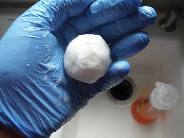 Sosteniendo la bola cubierta de lana en la mano, correr bajo el agua caliente en primer lugar, agregue jabón y aplasta como un loco: