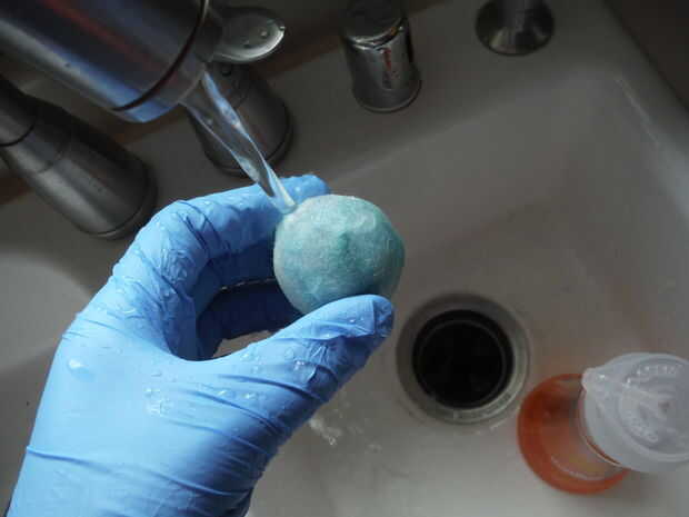 Interruptor para agua caliente y añadir la lana acento al azar en el planeta. Añadir otra gota de jabón para obtener la lana a sus fibras en la base de fieltro. Ejecutar dentro y fuera de la agua caliente para conseguir realmente jabonosa y resbaladizo. Puede empezar a rodar la pelota entre las manos para meterse las fibras enredadas. Cuando piensas en que la lana del acento ha sido suficientemente enlazada en el color base, correr la bola de lana en agua fría para contraer las fibras juntas otra vez. Si la lana de acento es todavía floja, sólo tienes que ir hacia el agua caliente, jabón, proceso aplastar/rodar otra vez hasta que los fieltros juntos.