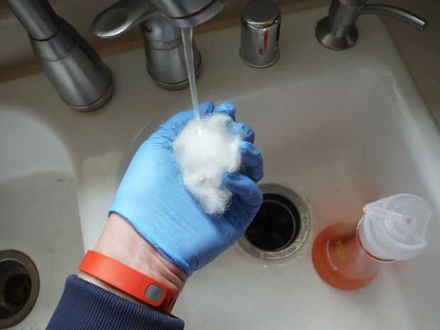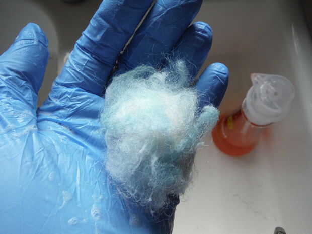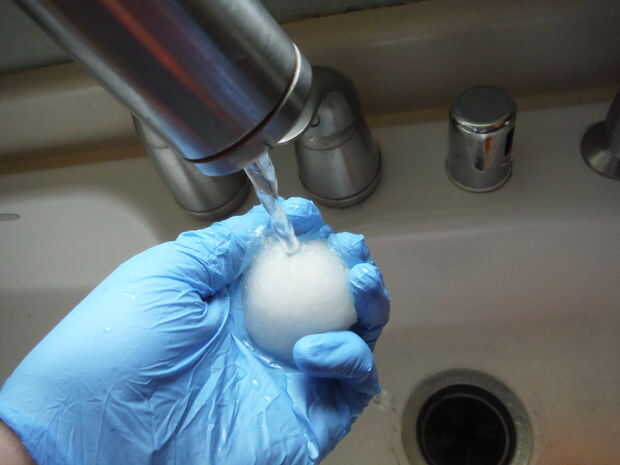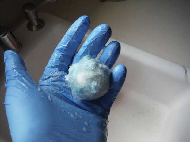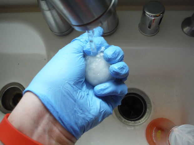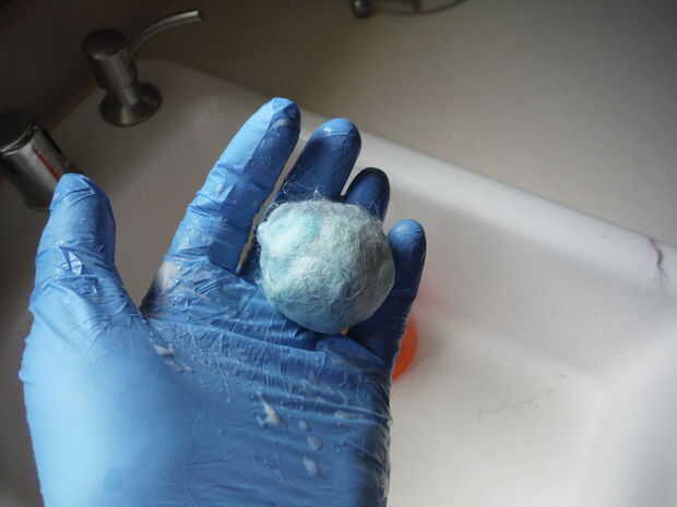 No tan caliente que usted se quema a sí mismo, pero quiere el agua realmente caliente para aflojar las fibras. Ahora agregar una pequeña gota de jabón líquido para manos y aplasta la bola de lana en sus manos como transferir la bola de la mano-a-mano. No el movimiento de "balanceo" sin embargo, como las fibras son todavía bastante flojas y podrían manojo hacia arriba en un extremo. Funcionamiento en y fuera de bajo el agua caliente otra vez como se aplasta la bola de lana, las fibras deberían comenzar a tejer se junto con la combinación de agua/jabón resbaladizo. Ahora el suéter de las lanas es todavía demasiado grande y flojo en el planeta, así que cambiar al agua fría y ver como los contratos de la lana en sí mismo y se contrae alrededor de la bola de espuma de poliestireno.