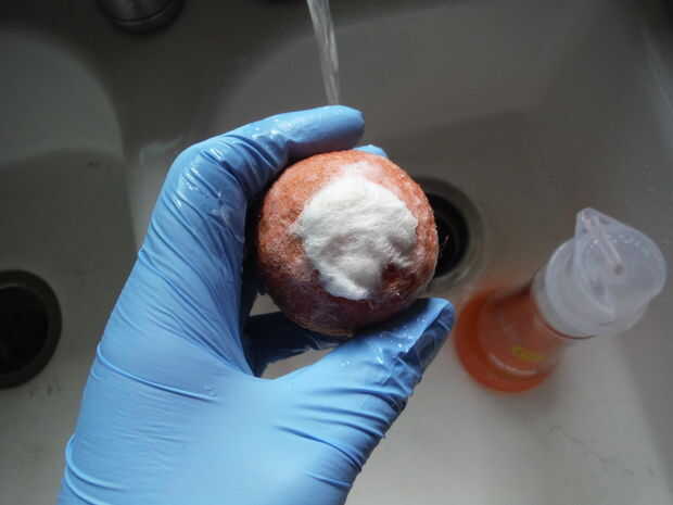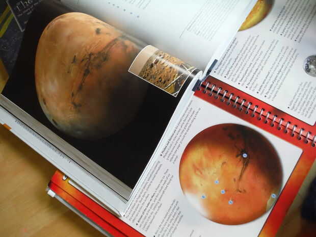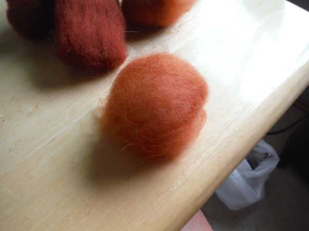 Después de wet felting el color base (lana naranja óxido) sobre la bola de espuma de poliestireno de 2 pulgadas, aguja fieltro blanco casquete polar en Marte, lo suficiente como para virar en el lugar. Entonces de agujas fieltro lana rojo oscuro para los cañones de Marte con mis libros de referencia. Después de toda la lana del acento se viró en su lugar, moje felted el planeta para darle su aspecto alisado final.