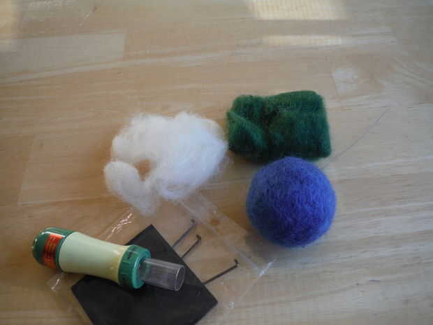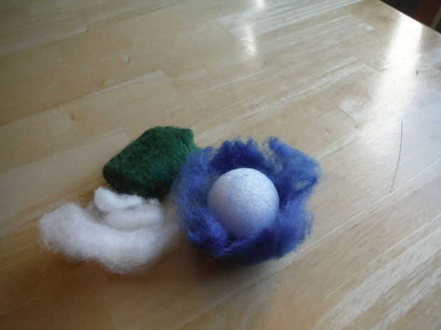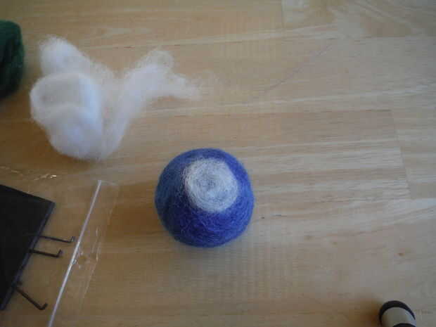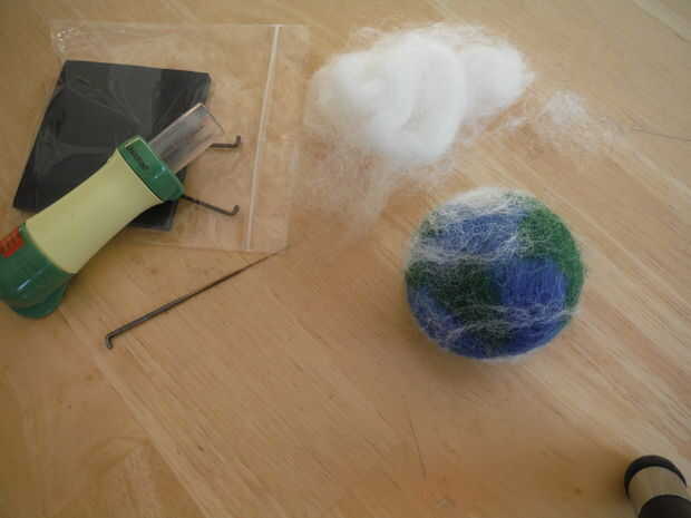 La tierra es de fieltro del mismo modo que el planeta Marte. El color base azul oscuro sobre la bola de espuma de poliestireno de 2 pulgadas de fieltro y entonces la aguja-felted el oscuros verdes y blancos los accidentes geográficos y tenues nubes blancas. Después de pasar por un fieltro húmedo final, tenemos nuestro planeta, la tierra!