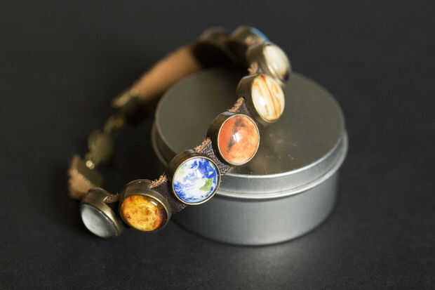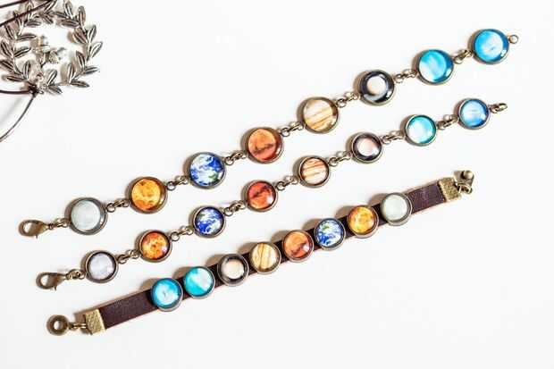 Pulsera artesanal sistema solar, Foto de planeta, vidrio, cobre y correa de cuero. cada planeta mide 1cm de diámetro.