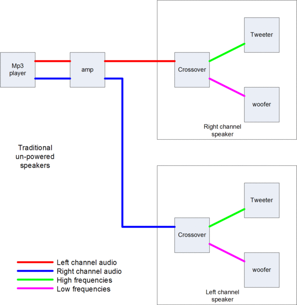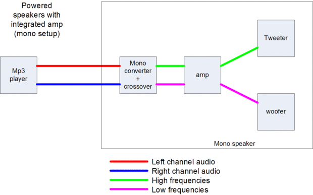 Cuando el cruce viene después de la amp, entonces tiene que ser grande para manejar la señal amplificada completa, y tiene que perder energía para igualar el volumen del tweeter y woofer. Pero siempre necesitamos dividir aparte las altas y bajas desde el reproductor de mp3 y los dirigen al tweeter y woofer. Así que el secreto para una configuración de amplificador integrado buena es que ponemos un pequeño crossover antes del amplificador. Esto nos da una señal no amplificada tweeter y una woofer amplificado sin señal. pase uno de esos a la entrada del canal izquierdo del amplificador, y el otro para el canal derecho de la entrada del amplificador. Luego en el lado de salida del amplificador cable canal izquierdo directo para el tweeter y el canal derecho directo al woofer.