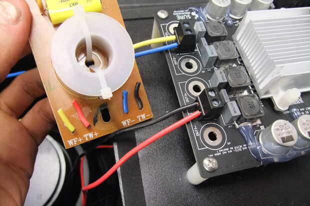 -conectar el woofer y el tweeter a la amp. Nota: dependiendo del tipo de crossover que utilizas, deberá dar la vuelta los cables de altavoz de agudos. Si usas mi cruce de monoXover (o cualquier cruce de orden 2), usted necesita mover de un tirón el tweeter: conectar el tweeter "+" a la salida del amplificador "-". el woofer está conectado siempre "hacia arriba" al amplificador. Si usted utiliza una mesa de mezclas estándar, conecte los dos de ellos "hacia arriba".