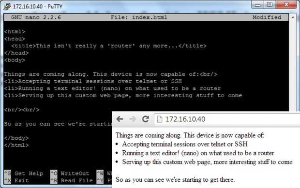 Hay literalmente cientos (o más) pasos en la transformación de una versión estándar de este producto TP-LINK en una caja inalámbrica wiki. De las imágenes que usted podrá obtener una idea de lo que terminamos con - el sitio web que se basa en OpenWrt y Haserl editando un archivo de texto con comentarios en él.