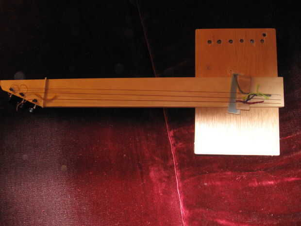 Guitarras de color van desde todos los robaban o piezas de ferretería hasta obras de arte un luthier podría tocar juntos en su taller si tienen algo de tiempo libre. Lo que necesitamos es algo con una caja de resonancia, cuello, clavijas de afinación y alguna forma de montar las cadenas. Otra vez, nada es muy crítico al diseño porque todas las mediciones exigentes para la sintonización y la acción en el cuello no son necesarios. Una caja en una mesa de uñas, añadir algunas clavijas de afinación y algunas cadenas de montaje!
