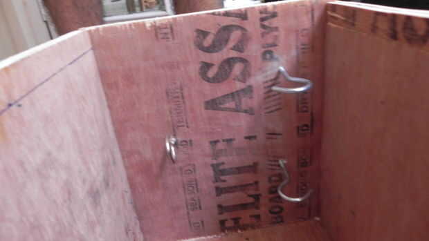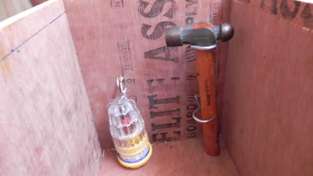 4. Fije dos lados ganchos uno sobre el otro en uno de los (24 x 24) de 10 mm de la caja. Tornillo de unos 5 cm de estos ganchos en el mismo lado, en otro gancho de 10 mm. Siguen las fotos para ver cómo el kit de martillo y un destornillador se en estos ganchos.