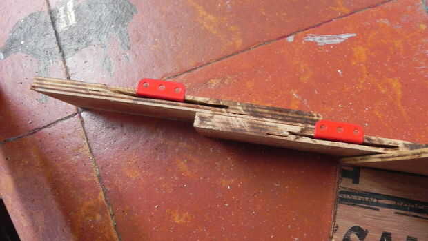 8. ahora, cerrar los lados con bisagras pequeñas y luego introduzca el ángulo de metal pequeño en la ranura. Una vez hecho esto, poner algun pegamento rápido en el arte superior del ángulo. Cerrar rápidamente el lado con bisagras grandes en los ángulos de metal pequeño. Una vez que el pegamento se haya secado, levante el lado con bisagras grandes. Este es su mecanismo de bloqueo.