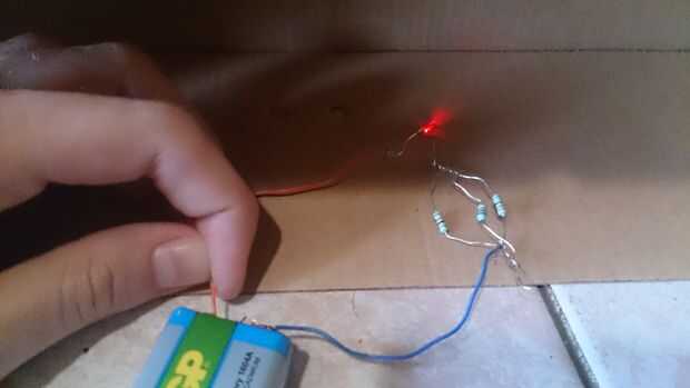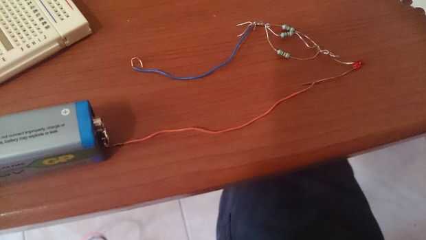 Si hicimos los calculos correctamente al unir ambos alambres a la bateria el LED deberia situado (imagen 3)