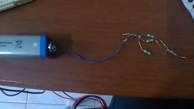 primero conectaremos la pata negativa del led (la pequeña) a uno de los extremos de nuestras resistencias, en el otro extremo de las resistencias uniremos un alambre ira conectado al polo negativo de nuestra batería (imagen 1)