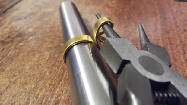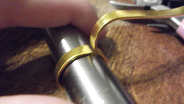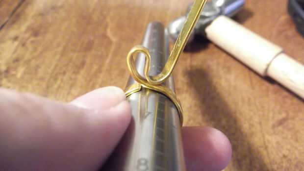 Mientras sostiene firmemente el anillo formado contra el mandril de la corteza, los alicates de punta redonda y un lazo que sale al final del anillo con la cola de 2 a 3 pulgadas que había dejado. No te preocupes de lo que es bastante, esto es solo para que tengas algo para colgar los calibradores de anillo de.