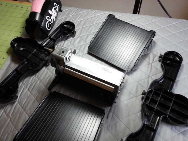 Ahora con cuidado retire las partes de plástico. Se colocan con los clips a la entrada y hacia fuera-avance de la mesa así que cuidado de no usar mucha fuerza y romper estos. A menudo quitando los lados de las tablas debe deslizarse bien y entonces los escudos plástico superior e inferior deben ser fáciles de quitar de la armadura del rodillo.