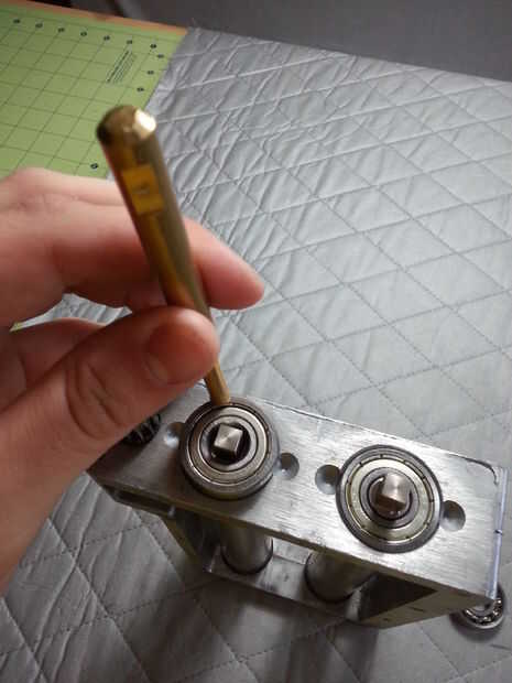 Coloque los rodillos en el bastidor y empezar el cojinete. Utilizando la barra de latón y martillo golpee suavemente en el cojinete mientras que hace su manera alrededor del exterior. Usted quiere que vaya uniformemente para que no se unen en el eje ni dañar al bering. Una prensa de árbol podría ser útil aquí. Una vez que el cojinete está en lugar asegúrese de que todo se mueve libremente. Ahora a montar todo.