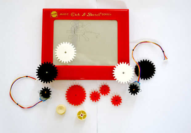 En la plantilla, el equipo más grande es para el Etch-A-Sketch y la más pequeña para el Motor paso a paso.
