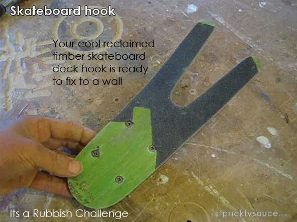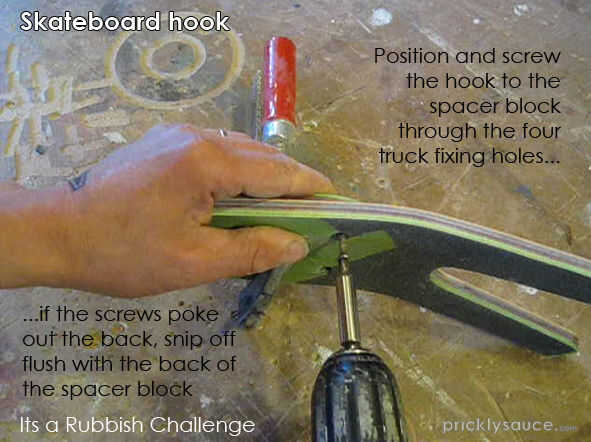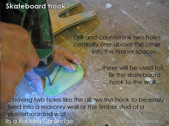 Taladrar y avellanar dos orificios de fijación central para el espaciador de uno sobre el otro. Esto permite fijar el anzuelo firmemente a un poste de madera.