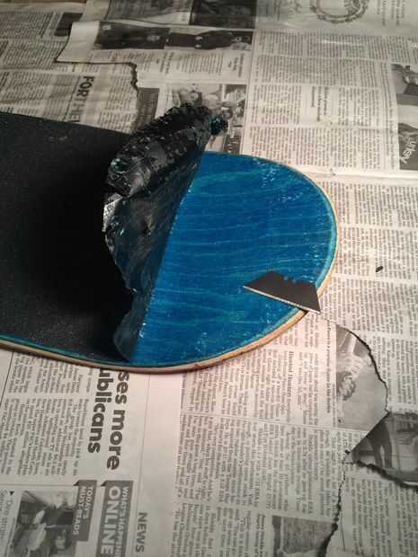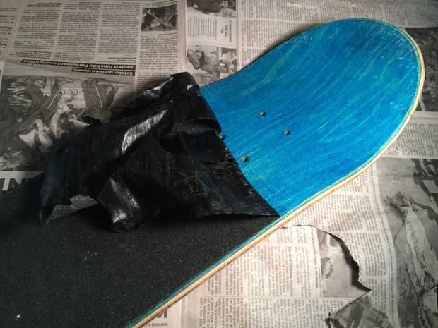 Fuentes son compradas o reunidas, entonces empezarás a Retire la cinta de agarre de la parte superior de la Junta utilizando una cuchilla. (Tenga cuidado usando la cuchilla) Comenzar por pelar la cinta del apretón en el los bordes de la Junta de un lado hacia el lado opuesto. Es mejor pelar la cinta de agarre en una zona cálida.
