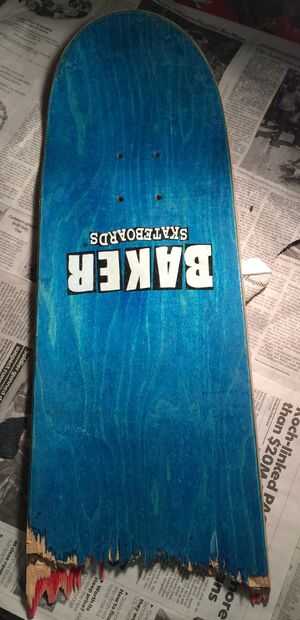 Estaba skateboarding temprano una mañana con mi perro cuando me topé con un deck de skate de madera roto cerca de las rampas de skate.Recogiendo hasta que me di cuenta de que sería un gran patín gancho... alguien la pérdida podría ser reclamada.Ven c