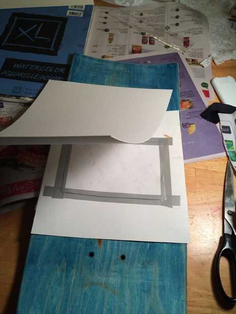 Que el cemento cola del gancho agarrador y comenzar a poner una buena cantidad de pegamento en la parte posterior del papel de acuarela. Coge otro papel de acuarela y colóquelo en la parte posterior del marco. Una vez colocado la derecha agarre la cinta y de cinta ambos extremos del papel acuarela. El papel de acuarela actúan como una cubierta trasera hacia arriba para el papel transparente, papel interno marco y foto.