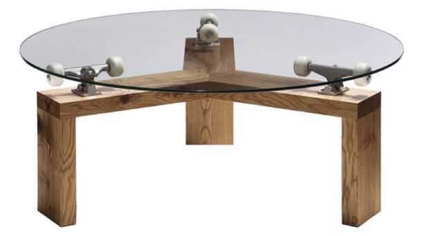 "Interacción del carro, rueda y vidrio perfectamente diseñado, la tabla 360 es un adulto lazy susan que celebra esa instancia de rebelión adolescente. Tomando en serio la afirmación de el patinaje es un estilo de vida, esta pieza se acomoda y equipa la vida bastante bien.