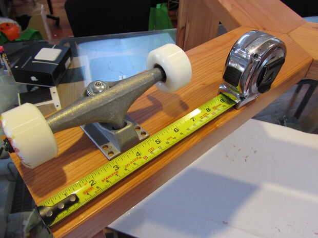 Centro de camiones en el tablero. Usted querrá que la rueda exterior que incluso con el borde de la junta radial. Medida, medida, medida. Marque el centro de los agujeros con la punta de un punzón o lápiz o un clip o algo más finos y puntiagudos.