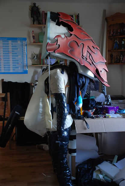 Vale la pena hacer simulacros partes como el caparazón en la foto. Estos para introducir mayores partes que hacen más tarde y también sirven como guías al hacer las partes. Mock up caparazón en esta toma fue hecha a mano alzada de Plastazote y pintada.